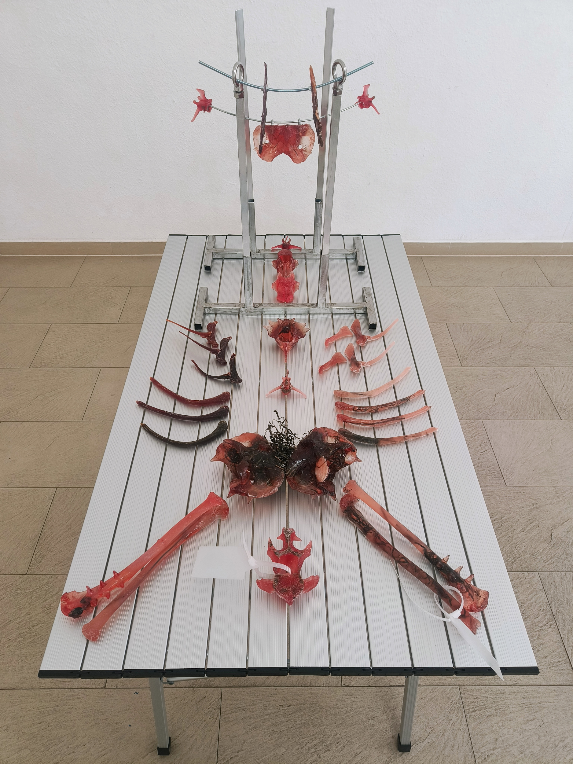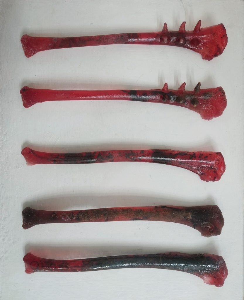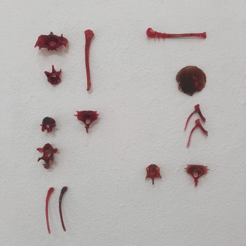 Kemialliset aineet ja luonnonmateriaalit kietoutuvat hauraisiin kokonaisuuksiin, jotka viittaavat säilöntäyrityksiin tai niiden seurauksiin. Teoksissa tarkastellaan kiertokulkua pintojen alla kehossa, ympäristöissä sekä hoivan ja kulutuksen rakenteissa.