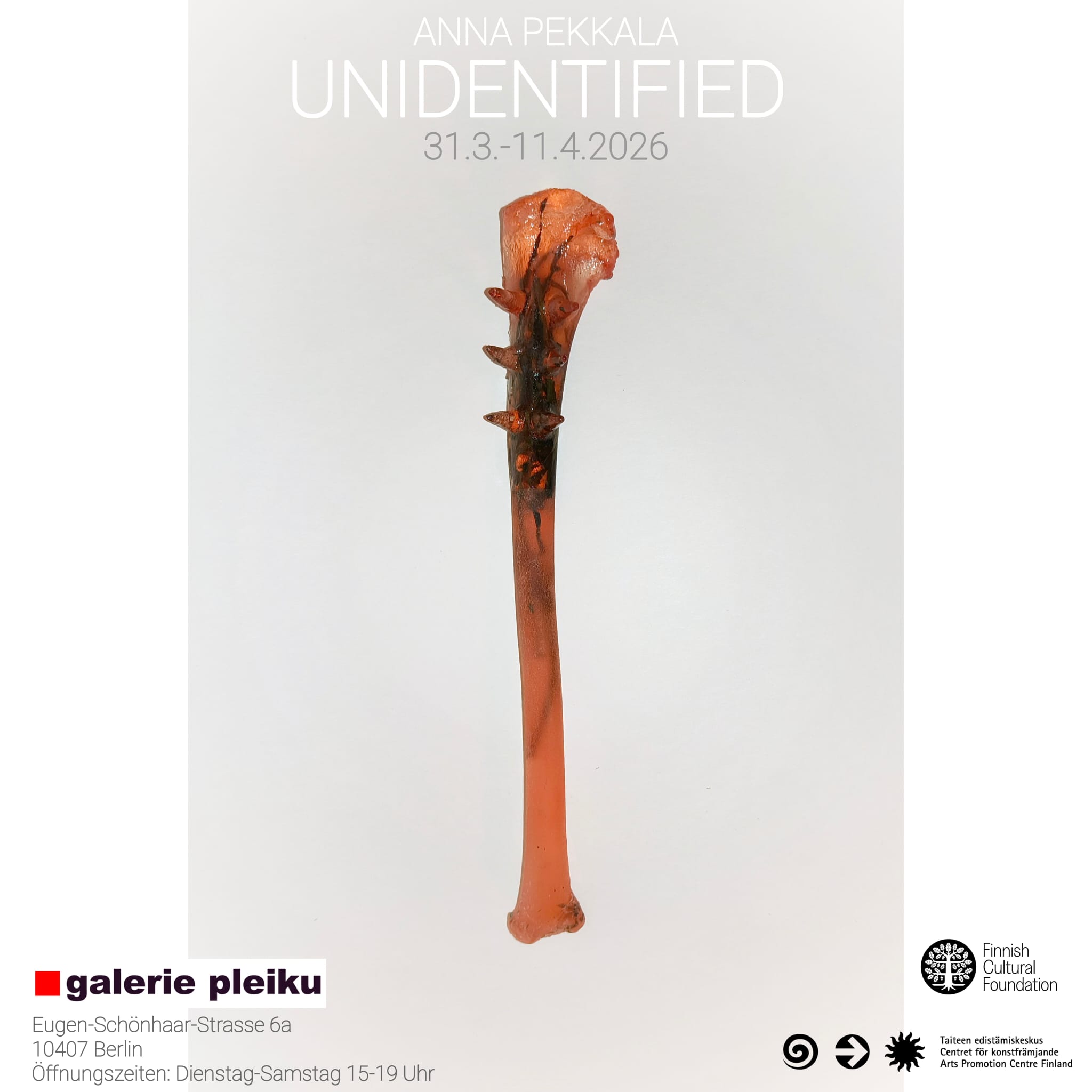 UNIDENTIFIED-näyttely oli esillä 31.3.-11.4.2026 Galerie Pleiku, Berliini. Näyttelyä tukee Suomen Kulttuurirahasto ja työskentelyä on tukenut Taiteen edistämiskeskus.
