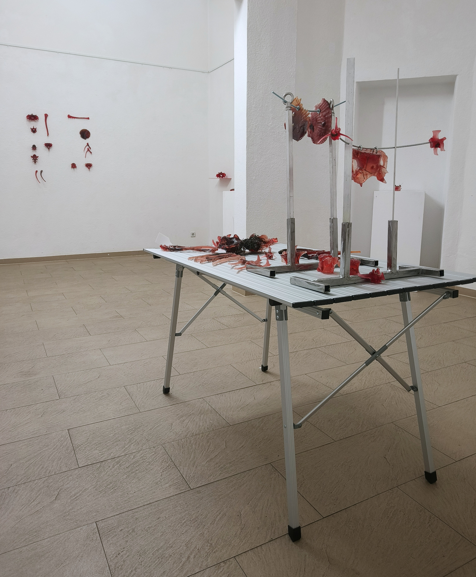 Chemical substances and natural materials intertwine in fragile arrangements suggesting preservation attempts or their aftermath. The works explore what circulates beneath surfaces, within bodies and environments, and through structures of care and consumption.
